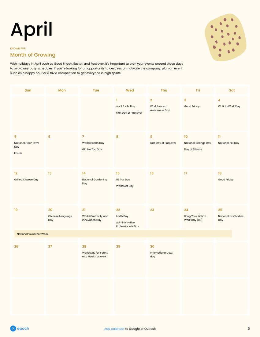 A moment to embrace growth, literally and figuratively. Encourage employees to get outside, start a small plant project, or reflect on personal and professional growth this season.