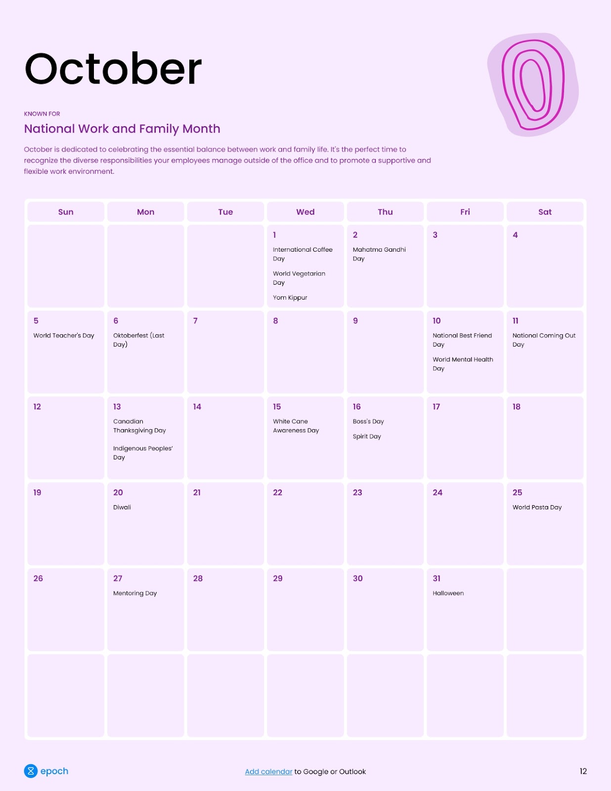 October is here, and with it comes a crisp autumn breeze, a flurry of exciting events, and endless opportunities to connect with your team! This month is all about embracing creativity, fostering well-being, and celebrating the diverse tapestry of your workplace. Let's dive into some key dates and ideas to make this October unforgettable for your employees!